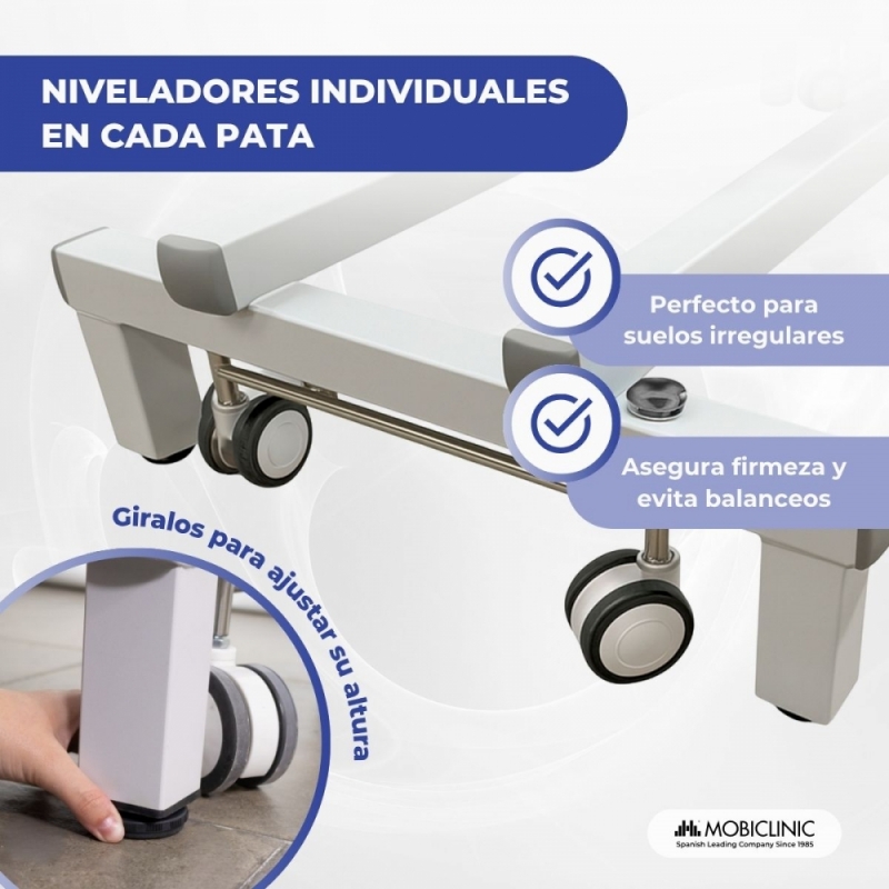 Para facilitar el movimiento y la estabilidad en consulta, cuenta con ruedas escamoteables de 7,62cm que se activan mediante pedal. Con este sistema, la camilla se eleva sobre ruedas para desplazarse cómodamente y vuelve a fijarse en una posición seguro al desactivar el mismo. Además, dispone de niveladores en cada pata para asegurar estabilidad en la camilla incluso en suelos irregulares.
