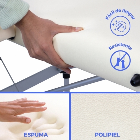 CÓMODA: esta camilla de masajes cuenta con un tapizado en polipiel muy elegante y agradable al tacto con la piel. Cuenta además con reposabrazos y reposacabezas para mayor confort.