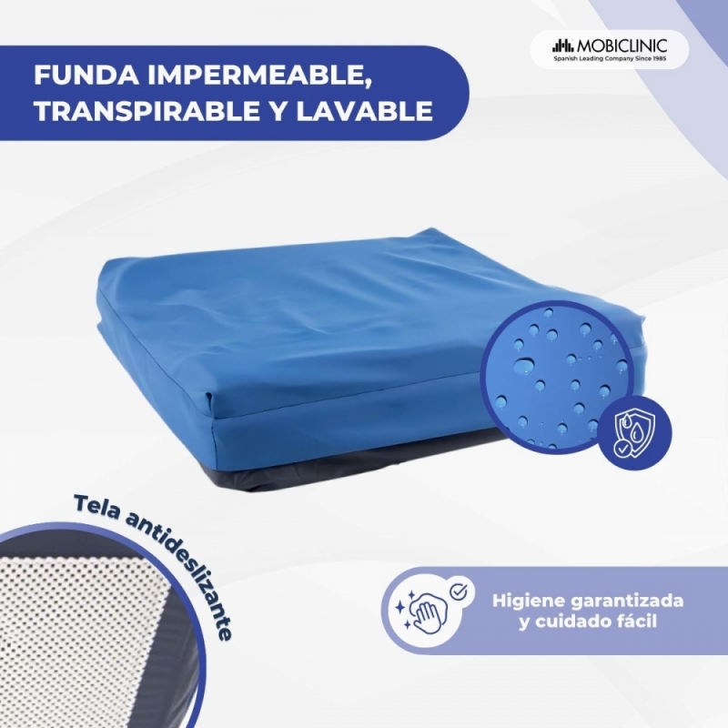 Podrá colocar este cojín antiescaras donde más le convenga aunque esta especialmente indicado para la silla de ruedas, ya que tiene un tamaño de 43 x 43 x 10 cm que lo hacen apto para la mayoría de las sillas. Además, incluye una funda exterior de protección, resistente al agua y fácil de lavar.