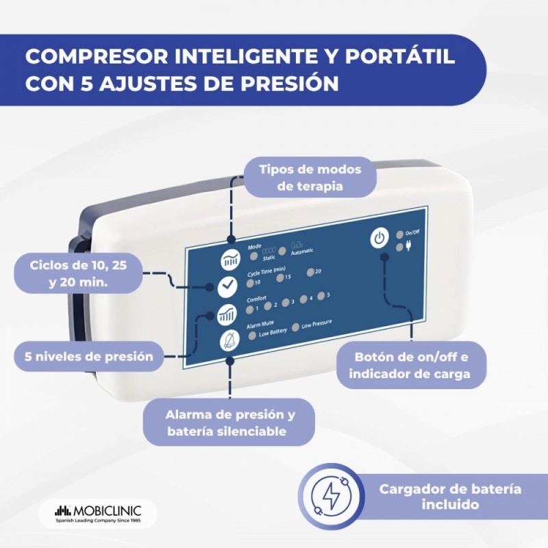 Sus celdas pueden alternarse en presión, gracias al mando compresor que incluye, con funda para su transporte. El compresor es de fácil uso, pudiéndose regular en 5 modos diferentes de alternancia de la presión, para el confort del paciente. Cuenta con un sistema de alarma de reducida presión y batería baja.