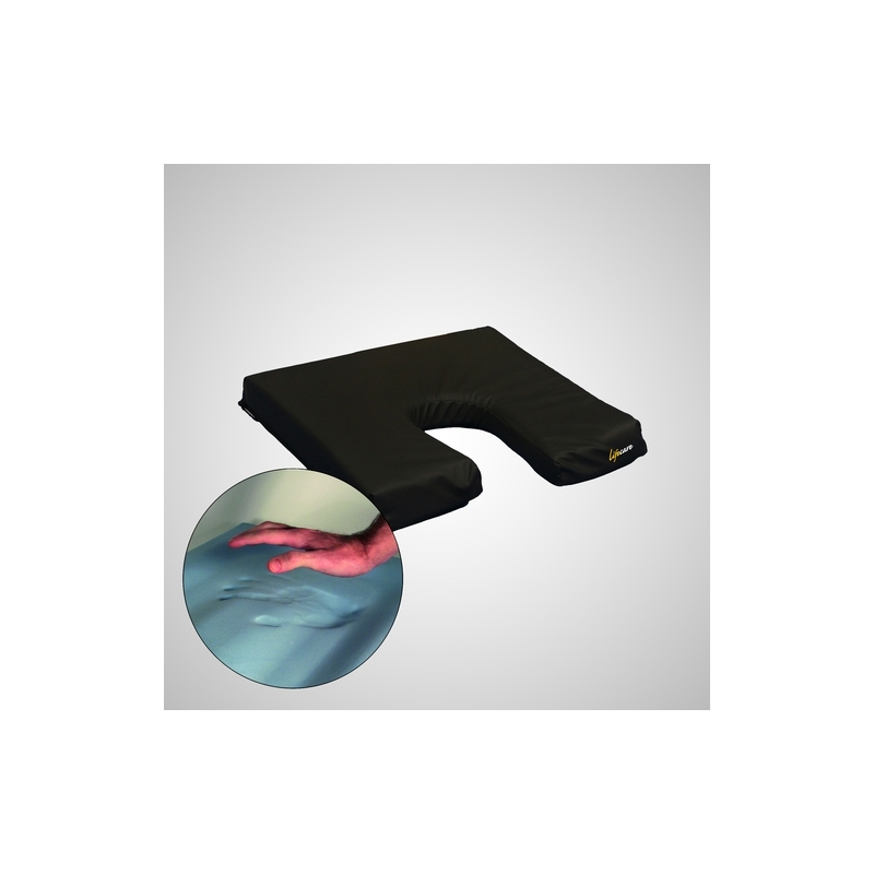 Cojín antiescara estetico, confortable, resistente y fiable con funda exterior lavable, antideslizante y con cierta resistencia al fuego. No desliza sobre el asiento. Se adapta con facilidad a las sillas de ruedas del mercado. Envasado en caja con asa para facilitar su transporte y almacenamiento. Perfil de herradura. Está compuesto de material viscoelástico con memoria. Posee una elegante funda exterior negra, hidrófoba, antideslizante e ignífuga: retardante de llama, y transpirable.1, con apertura sencilla tipo cremallera en U y asa para facilitar su manejo. Extremadamente ligero y fácil de limpiar. Confortabilidad personalizada para cada usuario. Uso recomendable hasta 100Kg.