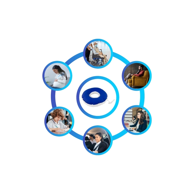 INDICACIONES: Gracias al agujero que presentan en su zona central pueden ser también utilizados para aliviar el dolor en cirugías de la zona anal, perianal, post-parto, así como dolores que se presenten en zona sacrococcígea, isquiática, glútea, perineal.