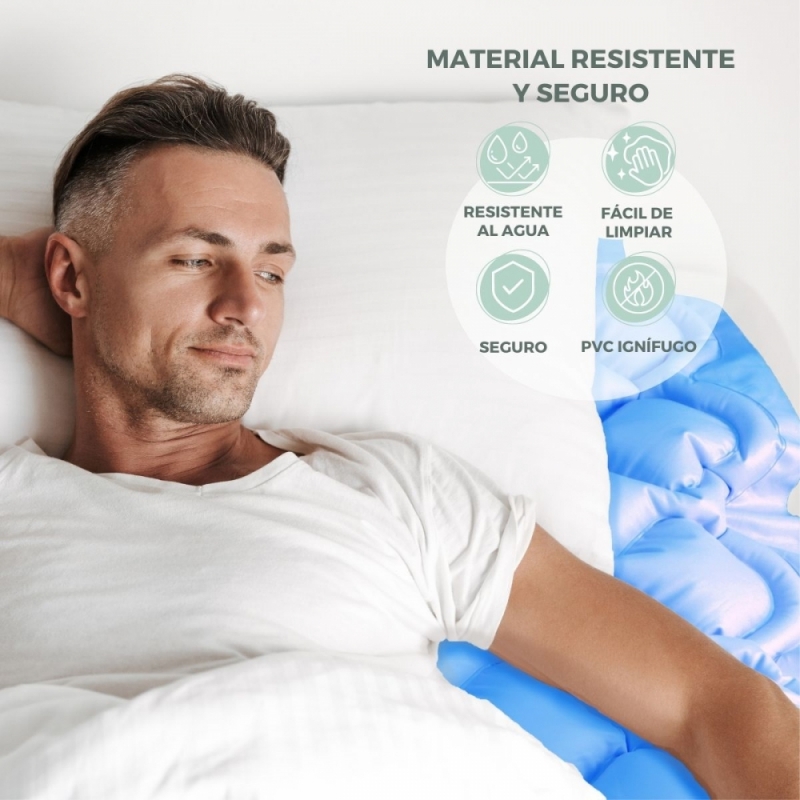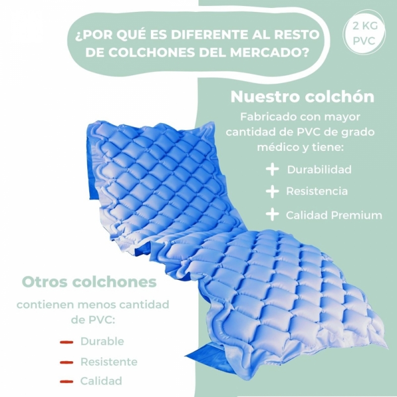 MÁS RESISTENTE Y EFECTIVO: Gracias a que contiene más material de PVC que otros fabricantes, el colchón pesa en torno a 2 kilos y sus celdas son más resistentes a la presión. Esto garantiza su efectividad y durabilidad, soportando mejor el peso del paciente.