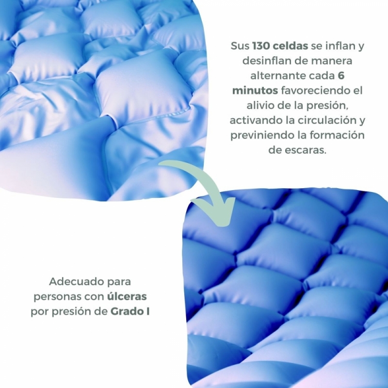 EFICACIA TERAPÉUTICA: Este colchón antiescaras ayuda a reducir el dolor del paciente y a aliviar la presión que genera el estar prolongados periodos de tiempo tumbado. También mejora la circulación sanguínea y ayuda a reducir la fricción con el colchón y la aparición de escaras gracias a sus 130 celdas individuales de aire que se inflan y desinflan alternativamente en periodos de seis minutos, distribuyendo la presión que ejerce el cuerpo sobre la estructura
