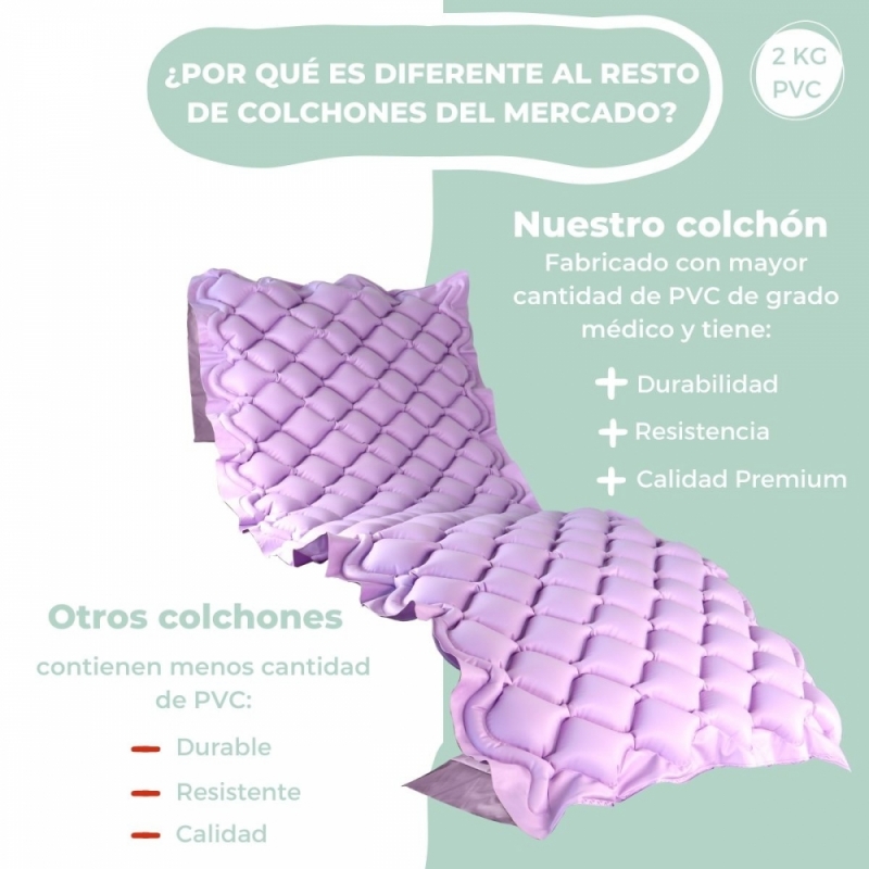 MÁS RESISTENTE Y EFECTIVO: Gracias a que contiene más material de PVC que otros fabricantes, el colchón pesa en torno a 2 kilos y sus celdas son más resistentes a la presión. Esto garantiza su efectividad y durabilidad, soportando mejor el peso del paciente.
