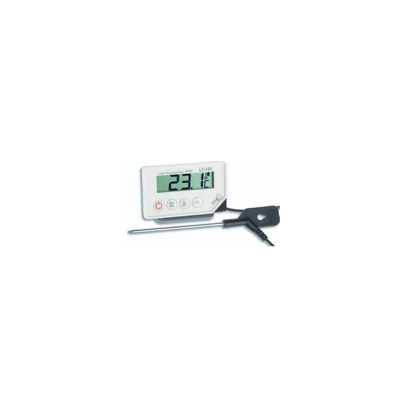 Termómetro digital de precisión con sonda de pincho para medir la temperatura de sólidos blandos o líquidos. De aplicación en el control de temperaturas en farmacias, hospitales, laboratorios, restaurantes, cátering, etc.