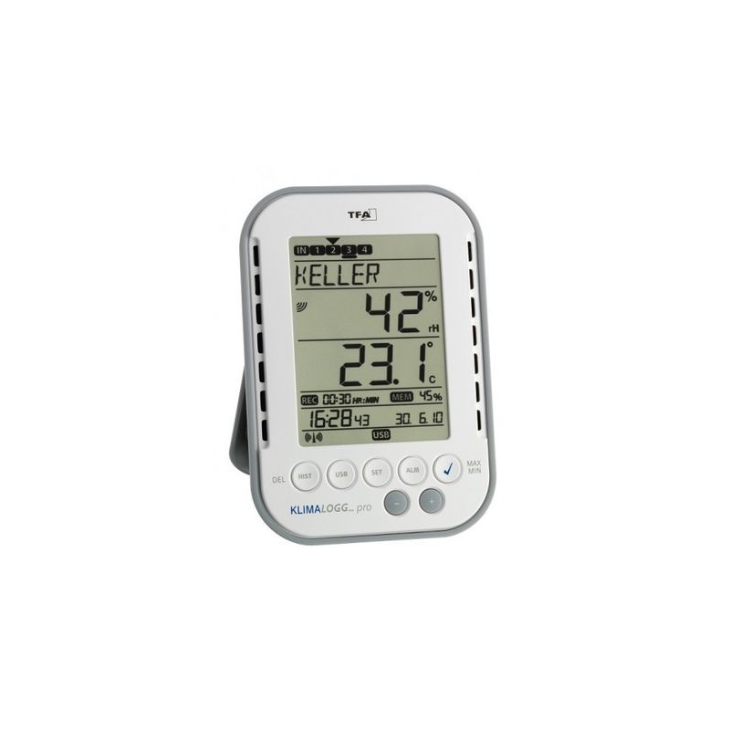 Este termohigrómetro sirve para medir la temperatura y la humedad relativa de un ambiente.Termo-higrómetro mural con función datalogger de registro de datos. Admite 8 sensores externos vía radio adicionales (no incluidos).