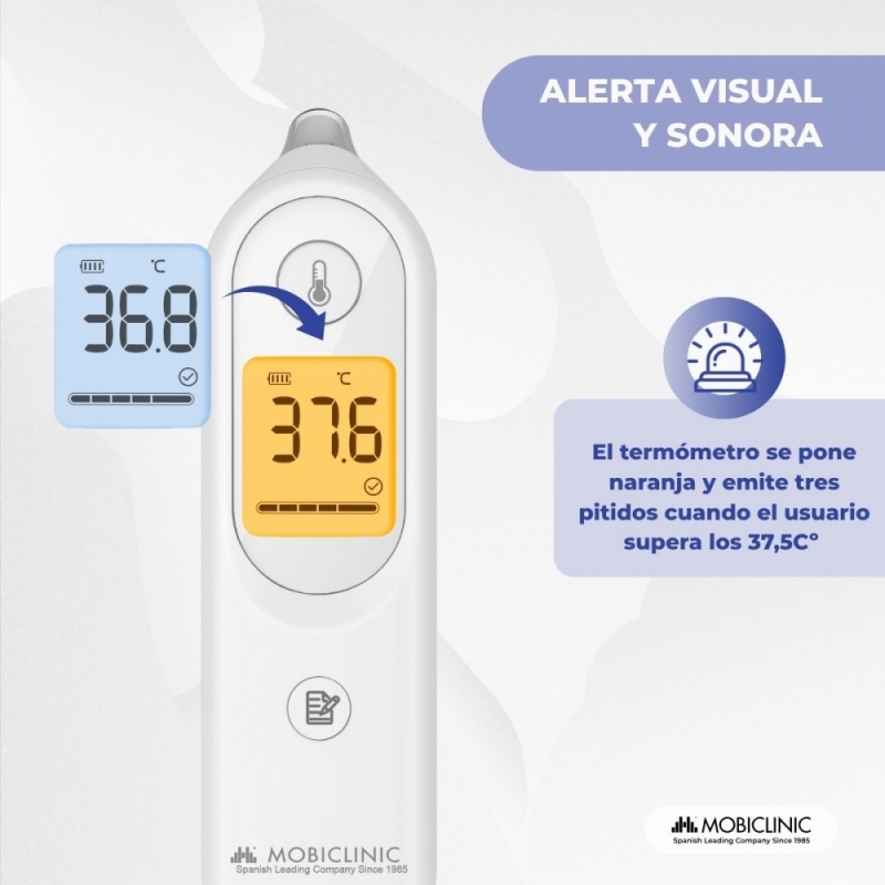 Su punta suave y moldeada está pensada para un uso seguro en el oído. Cuenta con un sistema de alerta inteligente que detecta si a temperatura supera los 37,5 ºC y emite un pitido largo seguido de tres cortos junto a la iluminación de la pantalla en color naranja, avisando de manera clara y rápida al usuario. Otra de sus grandes ventajas es su memoria integrada, almacena las últimas 7 mediciones permitiendo un seguimiento para conocer la evolución en casos de fiebre prolongada.