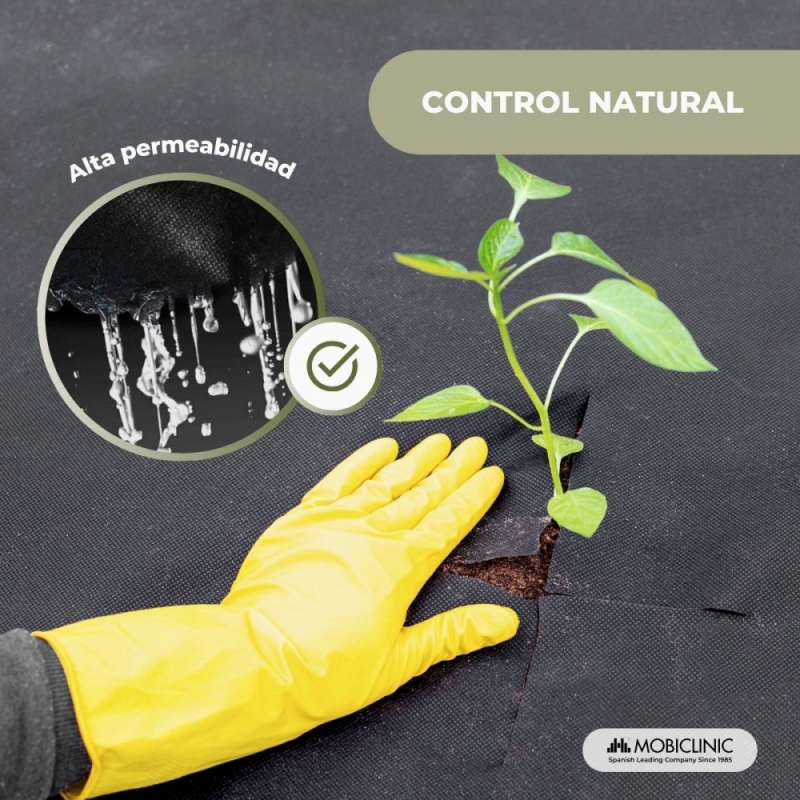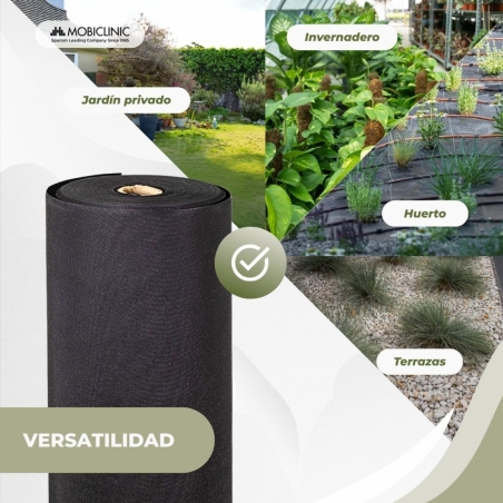 Su tejido transpirable y permeabilidad permite el paso del agua y aire, facilitando el mantenimiento de la humedad en suelos sin afectar a riego habitual. Además, es resistente a los rayos UV por lo que soporta la exposición directa al sol sin deteriorarse. Su instalación es sencilla y puede cortarse con tijera para adaptarse a diferentes tamaño según la necesidad.