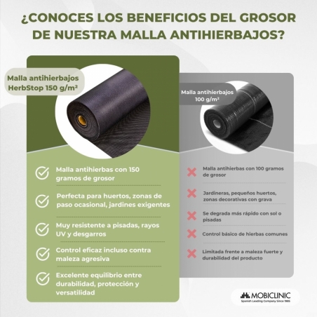 La malla antihierbas HerbStop es una solución ecológica y eficaz que combate el crecimiento de malas hierbas en jardines, huertos e invernaderos. Está fabricado con polipropileno de gran resistencia con gramaje de 150g/m², que permite una vida útil de hasta 2 años.