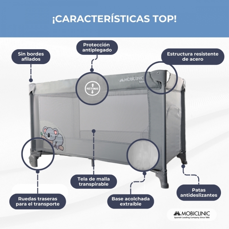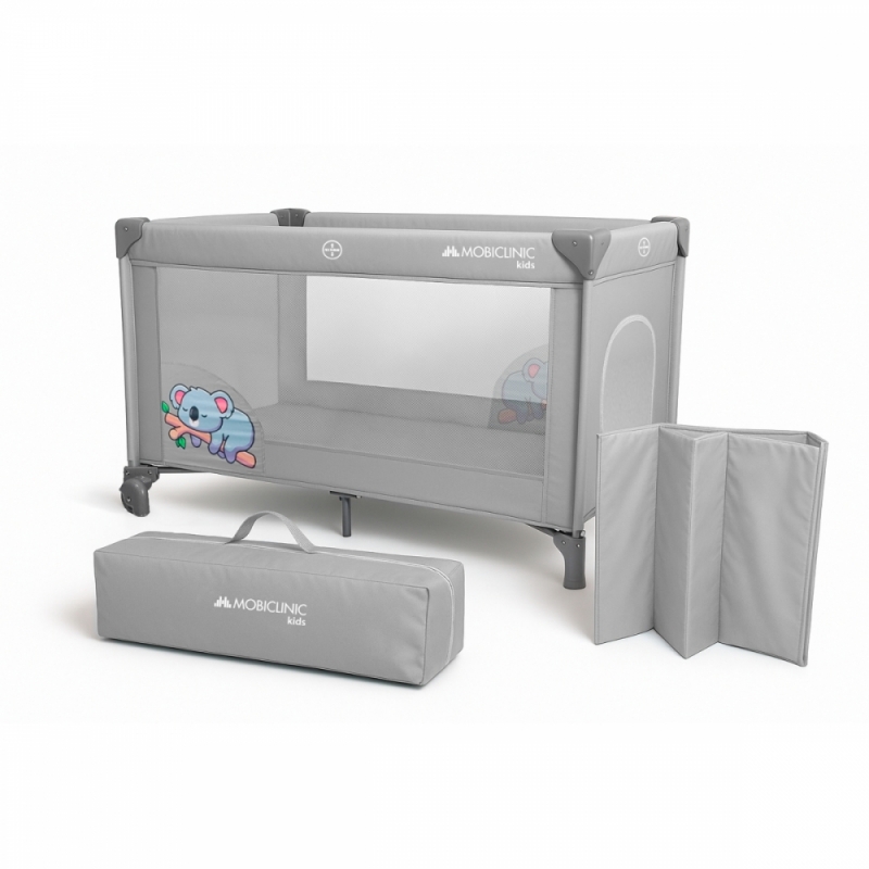 Cuna de viaje con ruedas | Portátil | Plegable | Resistente | Tela transpirable | Bolsa de transporte | Gris | Mofli |Mobiclinic