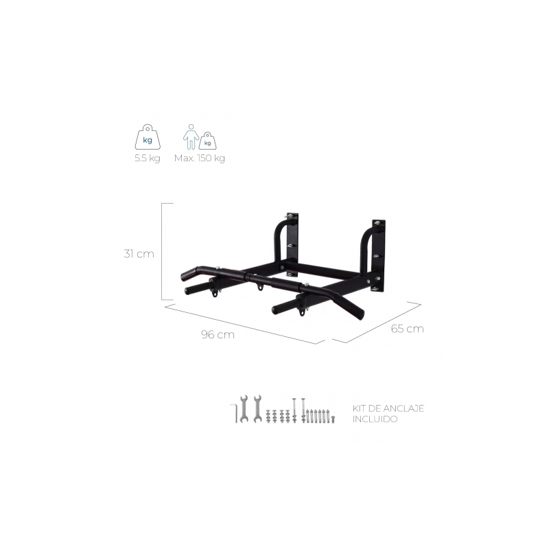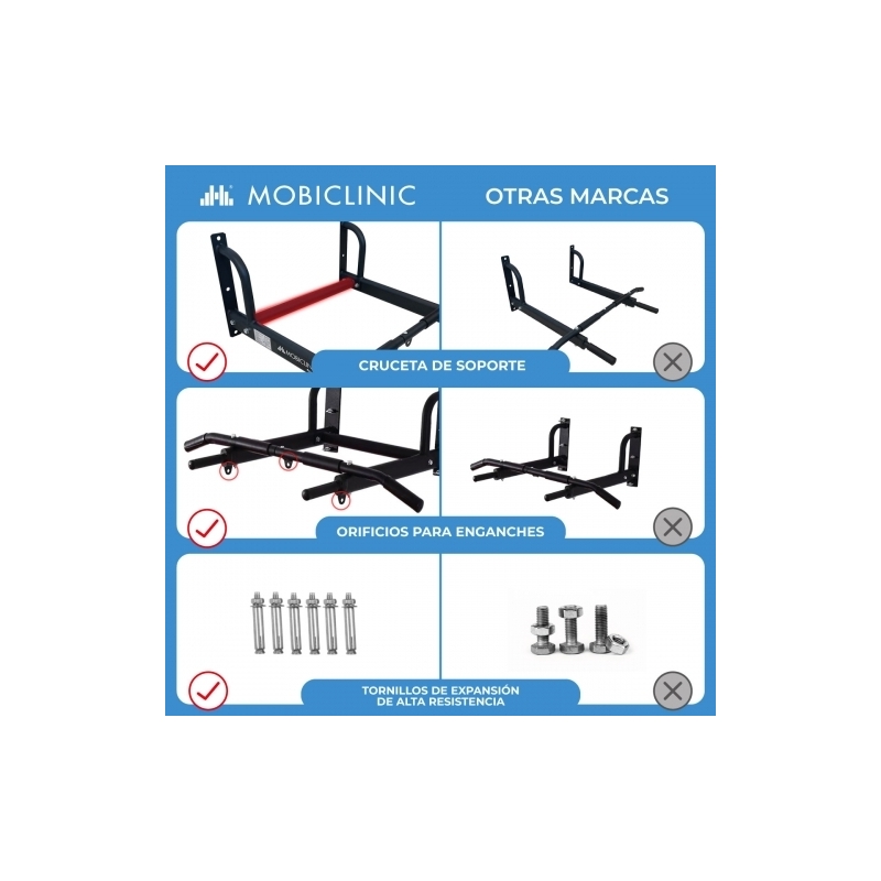 - Barra de dominadas: que incluye un kit de anclaje que facilita la instalación de la barra. También, diferentes enganches para poder aplicarle accesorios de ejercicios.
