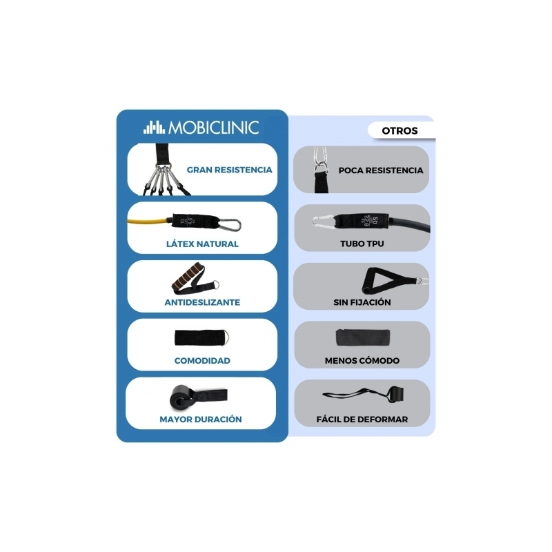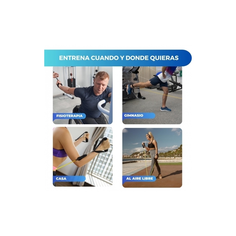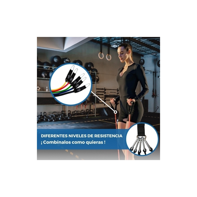 - Tubos elásticos: cuentan con un diseño único fabricado con látex natural, que aporta una mayor resistencia y flexibilidad. Además, los colores de las gomas elásticas fitness pueden ayudarte a comprender rápidamente la resistencia de la cuerda y evitar confusiones. Y, tiene mangos de espumas antideslizantes.