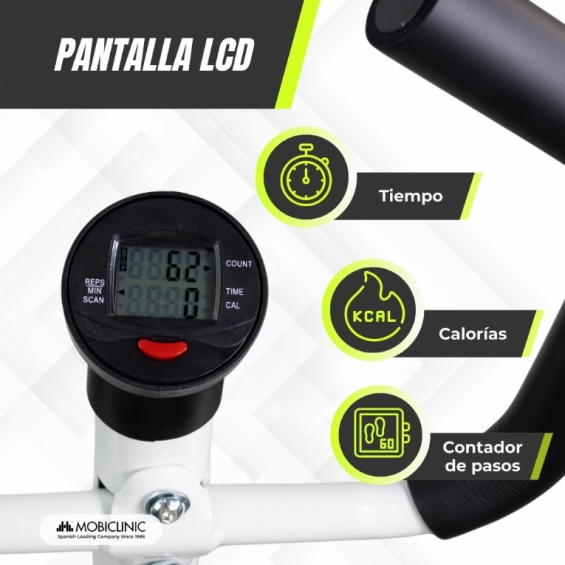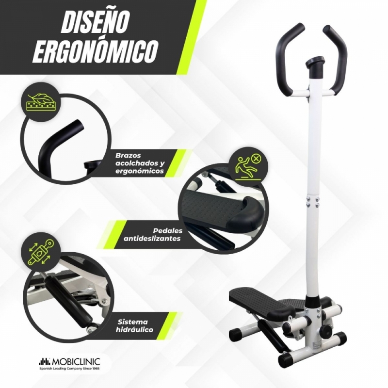 Gracias a sus brazos móviles ofrece un entrenamiento completo que mejora la coordinación y la resistencia mientras que ayuda a quemar calorías. Su diseño ergonómico ofrece un movimiento fluido, minimizando el impacto en articulaciones. Dispone de una pantalla LCD que muestra de forma automática los siguientes valores: tiempo de entrenamiento, calorías estimadas, pasos acumulados y pasos por minuto. Cuenta con apagado automático tras 4 segundos sin movimientos y función auto scan que alterna la información cada 4 segundos.