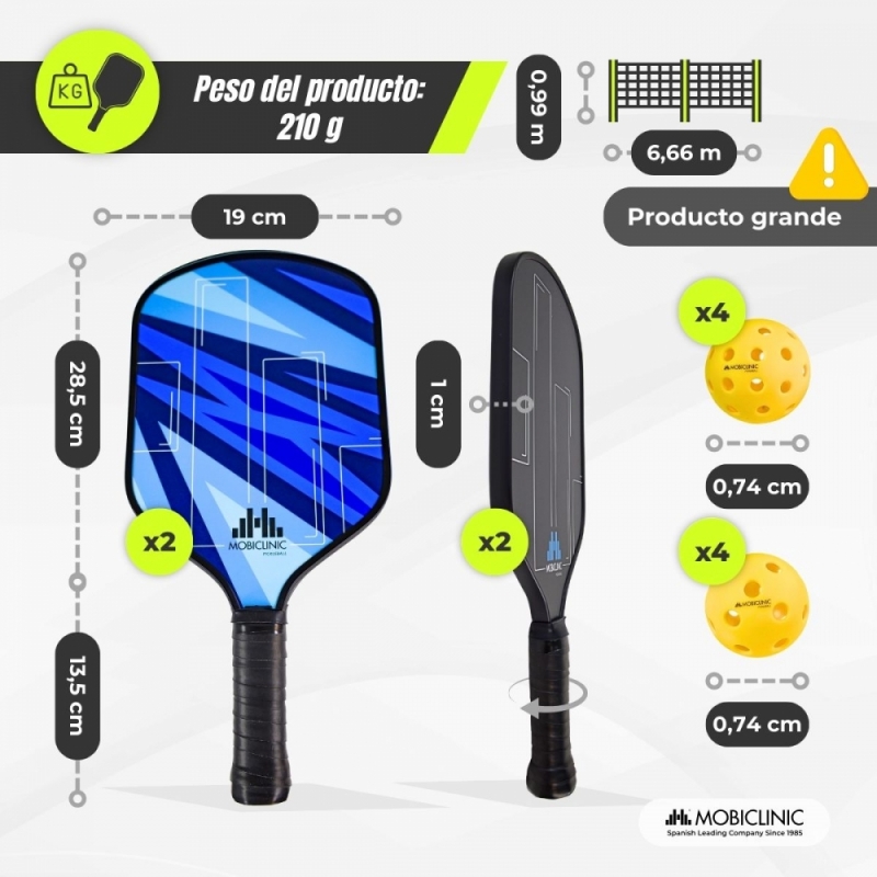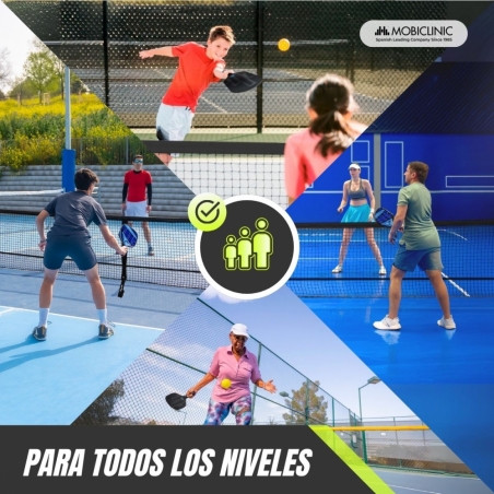 El set de Pickleball Mobiall es una opción perfecta tanto para jugadores principiantes como para exportes que buscan una actividad física completa y divertida. Incluye 4 raquetas fabricadas con fibra de vidrio y núcleo interior de panal de polímero, material que ofrece combinación de control y potencia durante el juego. Sus empuñaduras ergonómicas con grip antideslizante y absorbente aseguran una sujeción cómoda.