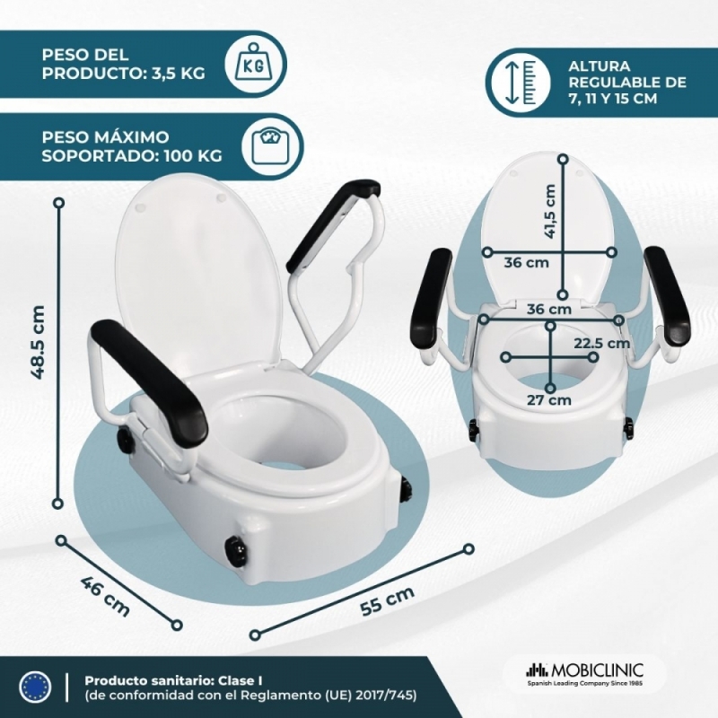 CONFORT Y DESCANSO: la fácil regulación e inclinación de los reposabrazos abatibles de este elevador WC y sus 19 cm de elevación lo convierten en un inodoro muy confortable y cómodo a la hora de sentarse e incorporarse. Además, puede soportar hasta un máximo de 100 kg.