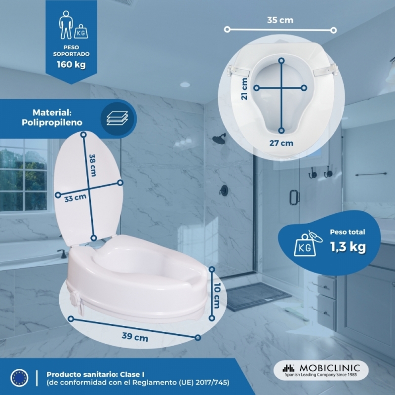 ACCESIBILIDAD Y SEGURIDAD: gracias a los 10 cm de altura que aporta este elevador de WC y su fijación al inodoro, los usuarios ganarán la calidad de vida y autonomía para ir al baño de forma independiente que necesitan. Soporta hasta 160 Kg.