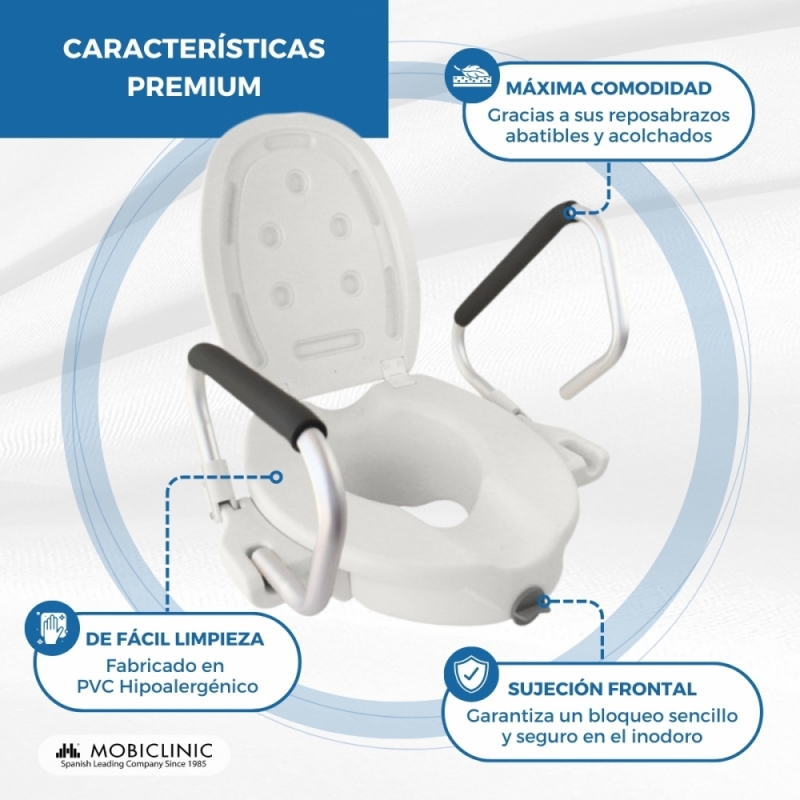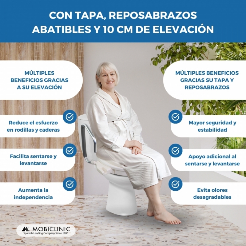 - Sus reposabrazos abatibles que ayudan en la salida del inodoro.