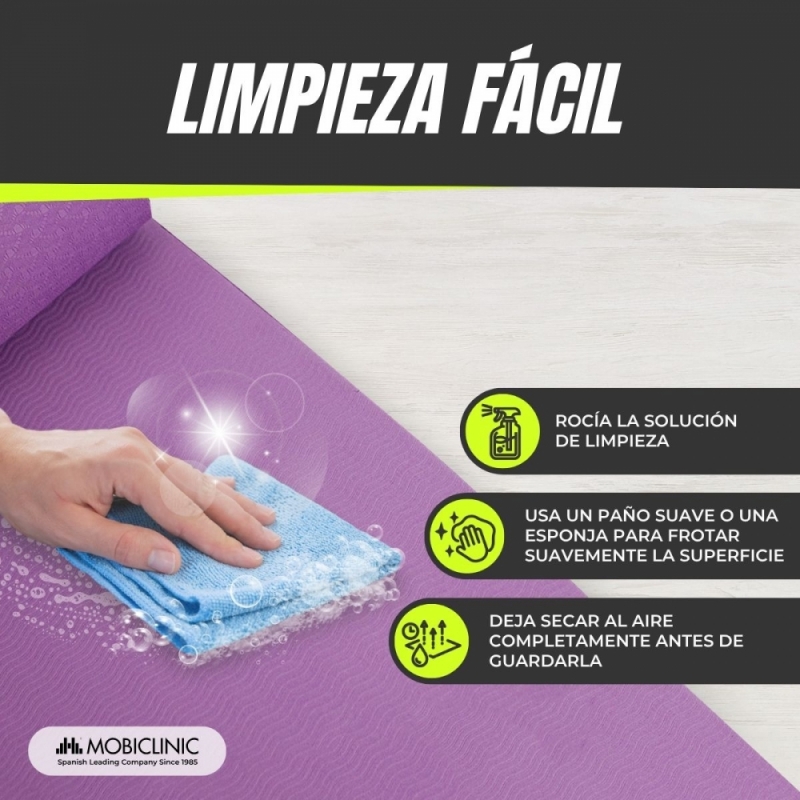 Una vez finalizado el ejercicio, esta esterilla es muy fácil de lavar, ya que simplemente tendrás que limpiarla con un paño con agua y jabón, luego enjugarla y finalmente secarla con un paño seco. De esta forma, puedes mantener tu alfombrilla como el primer día.