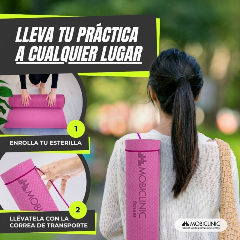Además, esta colchoneta de yoga y pilates incluye una cinta de transporte que permite trasladarla de una forma fácil y cómoda. Por lo tanto, se puede llevar fácilmente al gimnasio, parques o o cualquier lugar donde desees realizar el ejercicio.
