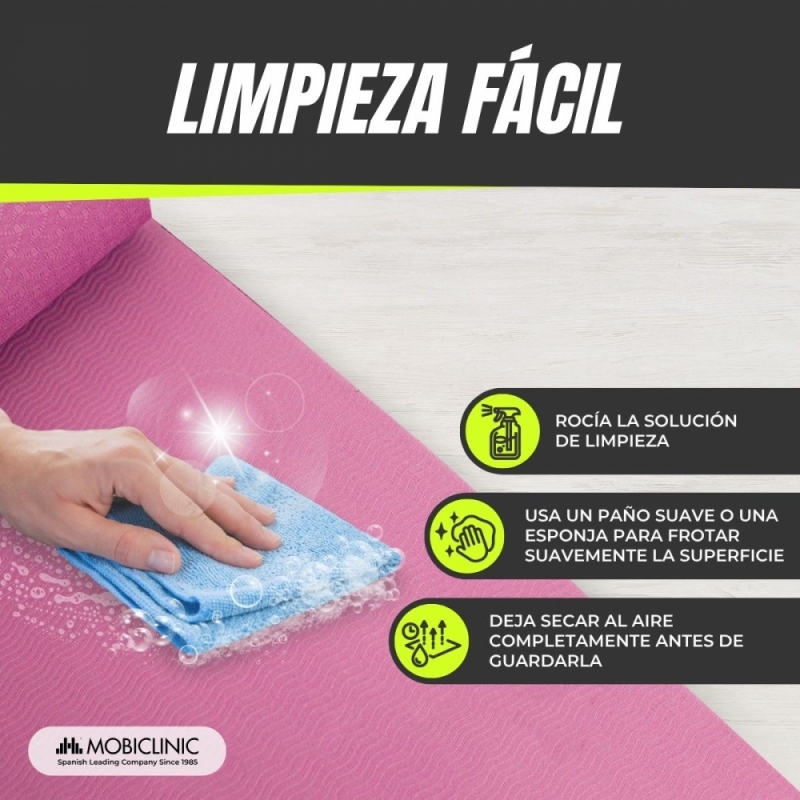 FÁCIL DE LIMPIAR: una vez finalizado el ejercicio, esta colchoneta es muy fácil de lavar, ya que simplemente tendrás que limpiarla con un paño con agua y jabón, luego enjugarla y finalmente secarla con un paño seco. De esta forma, puedes mantener tu esterilla como el primer día.