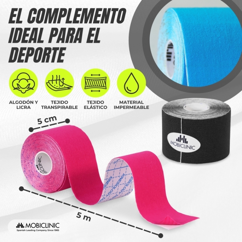 ELASTICIDAD: su composición a partir de fibras de algodón y elastano hace que las vendas kinesiológicas sean elásticas y amoldables al cuerpo, lo que garantiza la amplitud de los movimientos