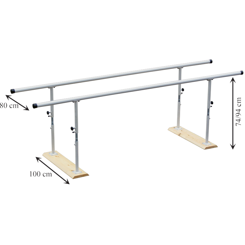 Exterior de madera barnizado natural y acero con acabado en epoxy. Barra de apoyo de acero recubierta en pvc para mejor agarre y calidez. Barra interior de la base de acero macizo zincado y acanalado para facilitar la regulación de la altura a través de tiradores con muelle que la fija en tramos entre los 74 y los 94 cm. Plegables en cualquier altura. Diseñada para paso interior de una silla de ruedas.