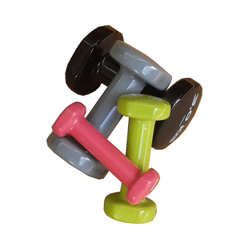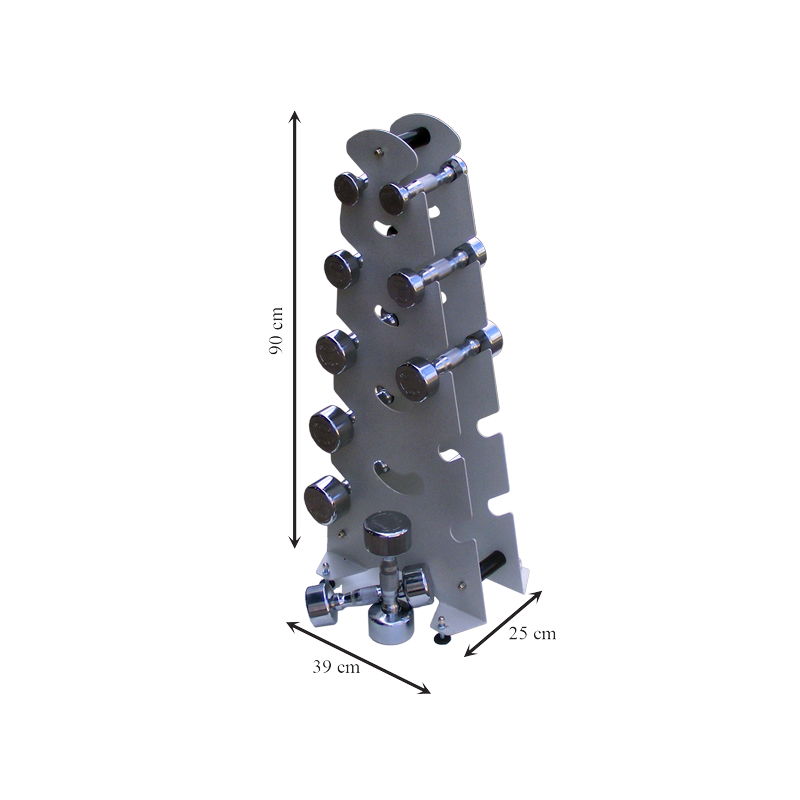 Soporte fabricado en acero con acabado en epoxy con capacidad para 5 pares de mancuernas. Diseñado para su total estabilidad apoyado simplemente en una superficie plana. Ahora las mancuernas son de vinilo de colores, quedando el diseño más moderno.