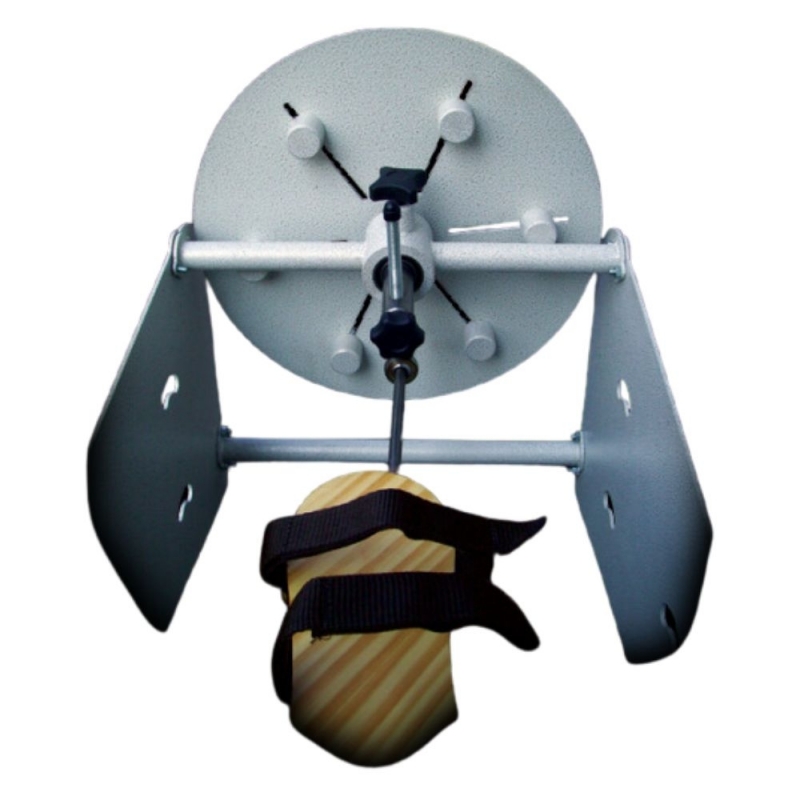 Diseñado para la ejercitación del tobillo y fabricado en chapa de acero con recubrimiento en epoxy, zapatilla de madera y cuero con sujeciones de velcro. Regulador de tensión según el esfuerzo necesario. Regulador para establecer el ángulo del pie.
