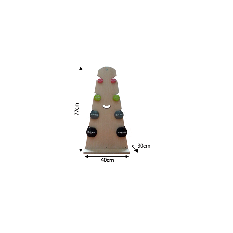 Soporte fabricado en madera barnizado natural con capacidad para 4 pares de mancuernas. Diseñado para su total estabilidad apoyado simplemente en una superficie plana. Ahora las mancuernas son de vinilo de colores. Consta de: