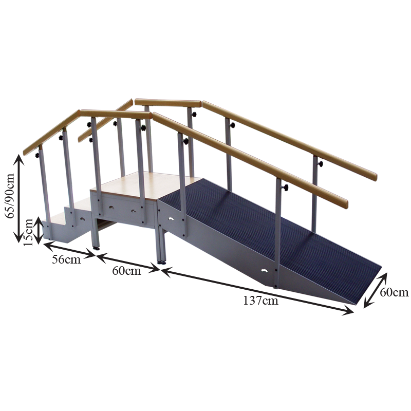 Estructuras de acero con acabado en epoxy, pasamanos, peldaños y descanso en madera barnizado natural, rampa de madera con goma antideslizante. Consta de: Tres módulos independientes (peldaños, descanso y rampa) para que puedan colocarse en cualquier ángulo o en línea según las necesidades, mediante uniones de acero con acabado en epoxy de fácil montaje y desmontaje. Pasamanos desmontables. Medidas: - Alto escalón: 15 cm. - Pisada escalón: 28 cm. - Alto suelo-descanso: 45 cm. - Largo modulo rampa: 137 cm. - Largo modulo descanso: 60 cm. - Largo modulo peldaños: 56 cm. - Alto pasamanos: 65/90 cm. - Ancho interior: 60 cm. - Ancho exterior: 65 cm.