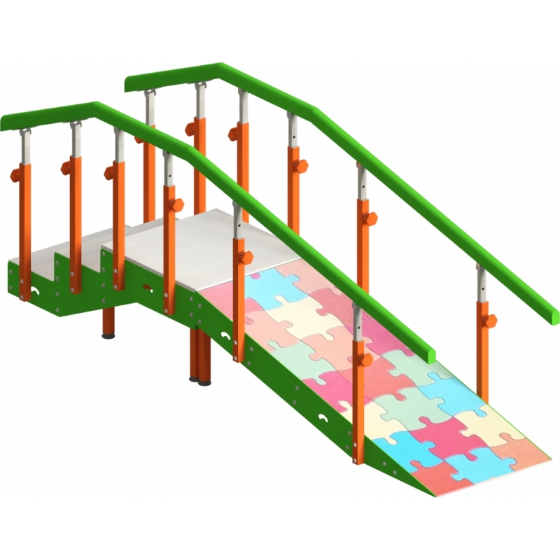 Consta de Tres módulos independientes, peldaños, descanso y rampa, para que puedan colocarse en cualquier ángulo o línea según las necesidades, mediante uniones de acero con acabado en epoxy de fácil montaje y desmontaje. Pasamanos desmontables regulables en altura (21 cm de recorrido) mediante pomos de rosca independientes.