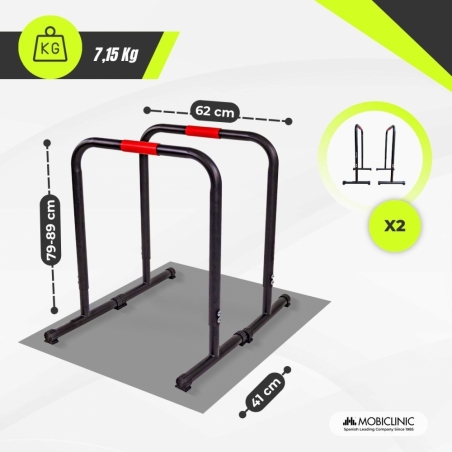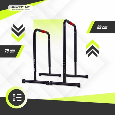 ALTURA AJUSTABLE: Estas barras paralelas cuentan con dos niveles de altura (79 y 89 cm) que se adaptan a las necesidades del usuario. Gracias a esto, podrás variar la intensidad de las rutinas según el nivel de fuerza y la estatura. Ideal para principiantes y usuarios más avanzados que buscan progresar en los entrenamientos de calistenia o crossfit desde casa