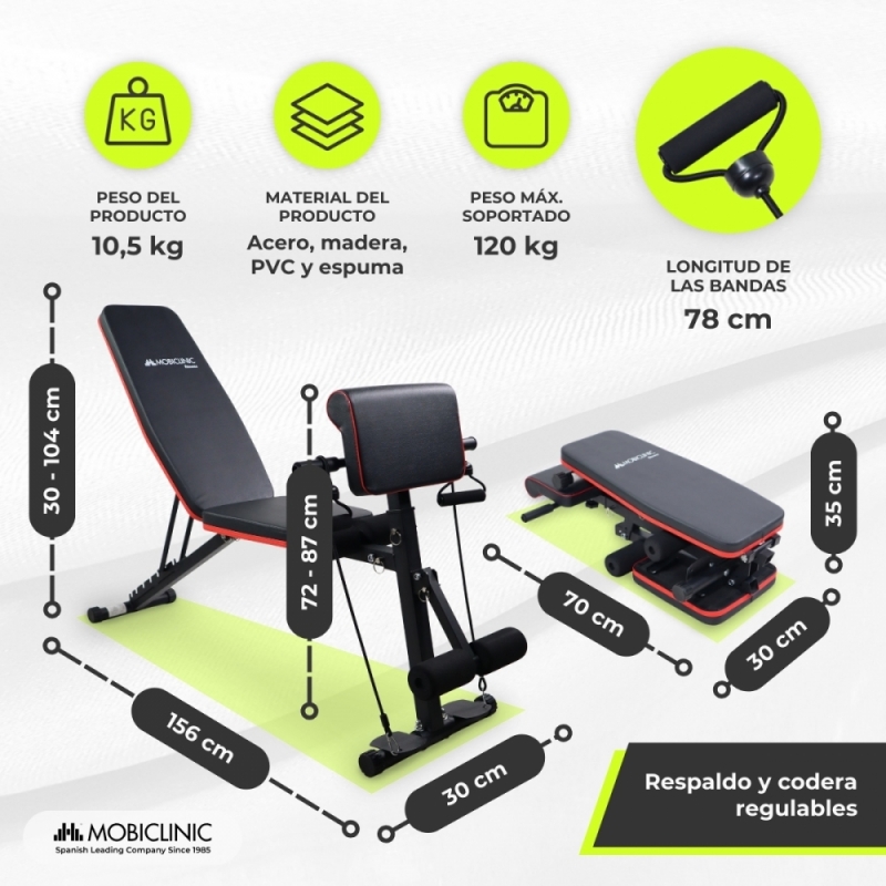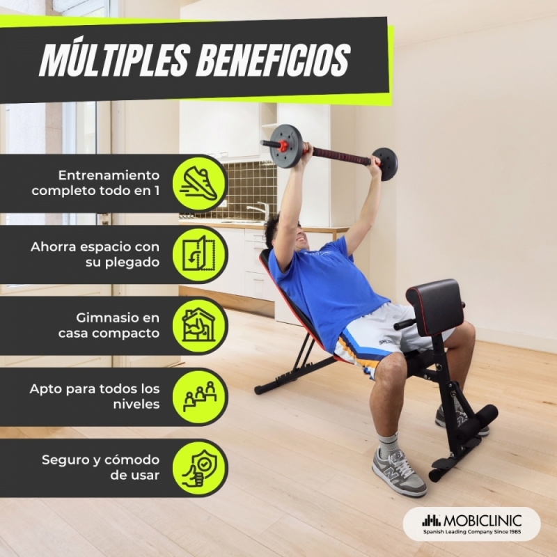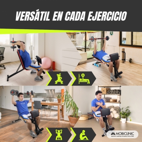 ENTRENAMIENTO COMPLETO: Este banco de musculación ajustable te permite realizar una amplia variedad de ejercicios, desde press de banca, abdominales, hasta flexiones y ejercicios de brazos y pecho. Es ideal para entrenamientos funcionales y específicos, aptos para principiantes y usuarios más avanzados. Además, incluye cintas de resistencia para ampliar las opciones de entrenamiento y trabajar más grupos musculares.