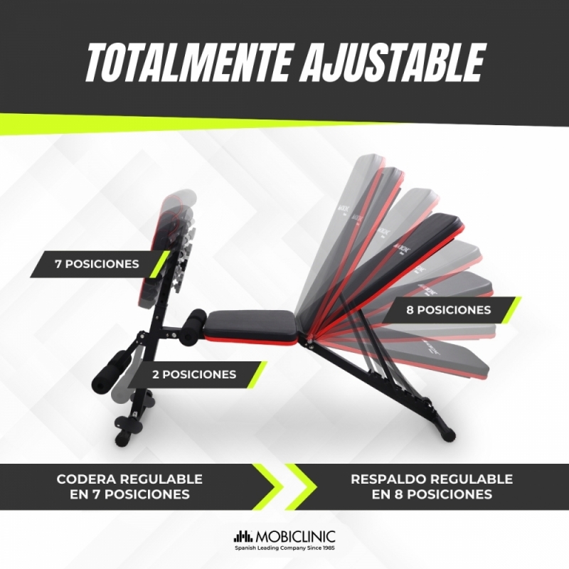 AJUSTABLE PARA CADA EJERCICIO: Cuenta con 8 posiciones ajustables para el respaldo y 7 posiciones para la parte delantera, brindando total versatilidad para personalizar tu entrenamiento. Además, cuenta también con almohadillas en los pies que también son regulables, asegurando comodidad y estabilidad al usuario.