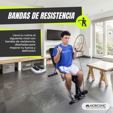 El banco incluye cintas de resistencia que permiten incrementar la intensidad de los ejercicios, proporcionando un ejercicio aún más completo. Con todas estas características, es un producto ideal para entrenar desde la comodidad de tu hogar y lograr tus objetivos.