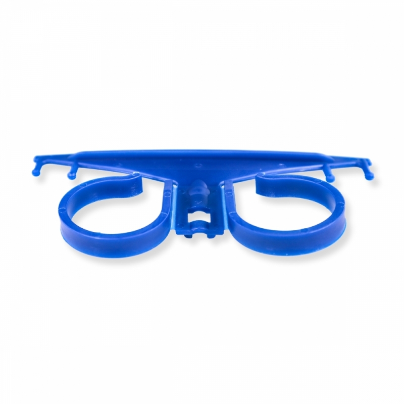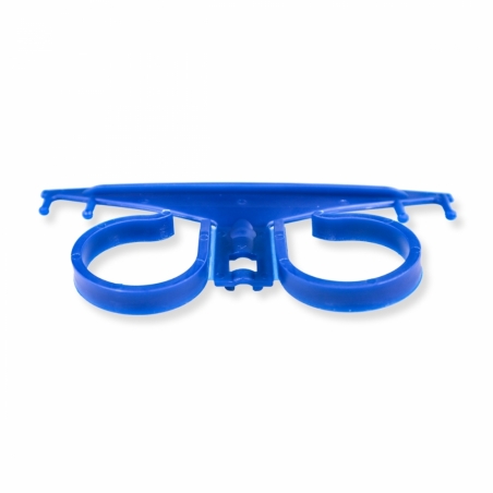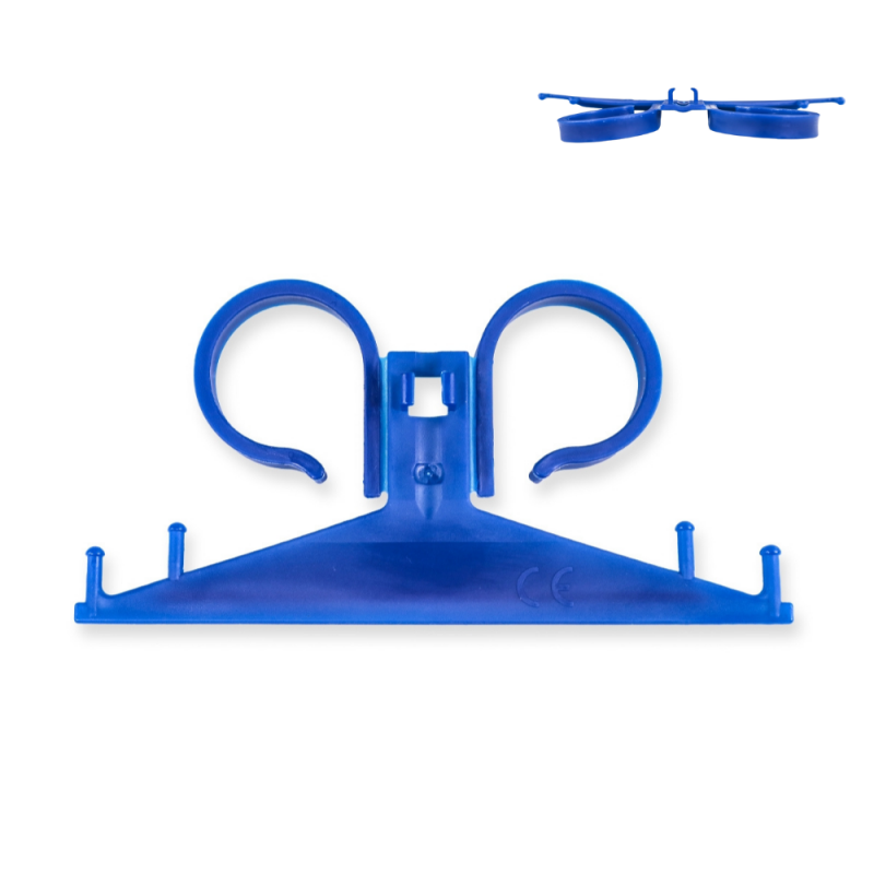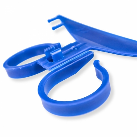 Soporte de plástico color azul para colgar bolsas de orina de pacientes encamados en el lateral de la cama.