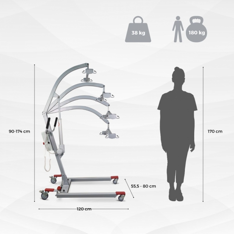 CAPACIDAD: Esta grúa ortopédica soporta un peso máximo de 180 kg. En cuanto a su distancia de elevación es de 90 a 174 cm. Además, su radio de giro es de 127 cm, mientras que el brazo rota unos 180º. Puede descender hasta una altura de unos 20-30 cm del suelo aproximadamente.