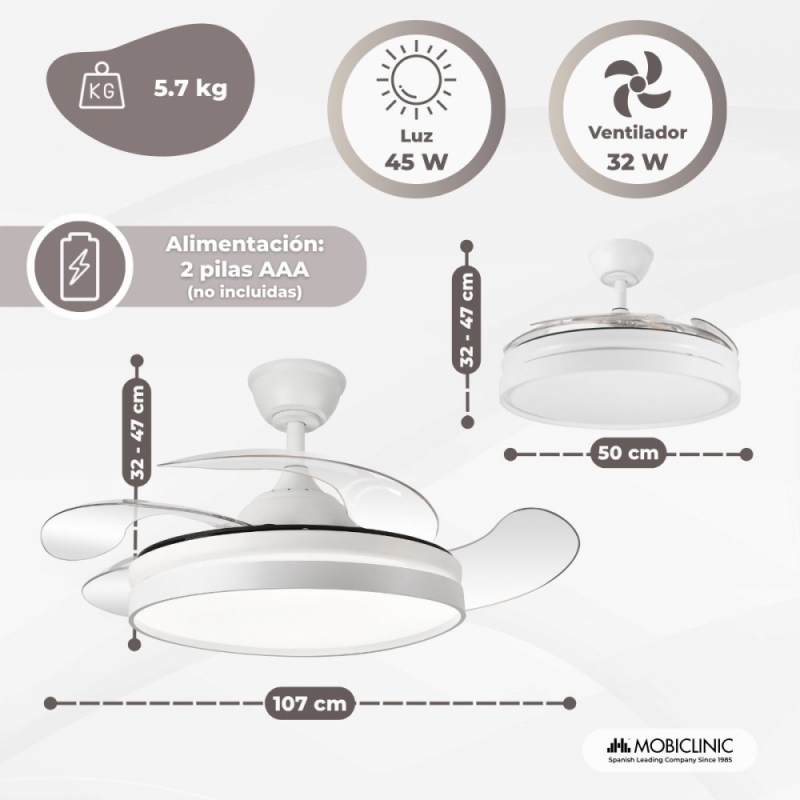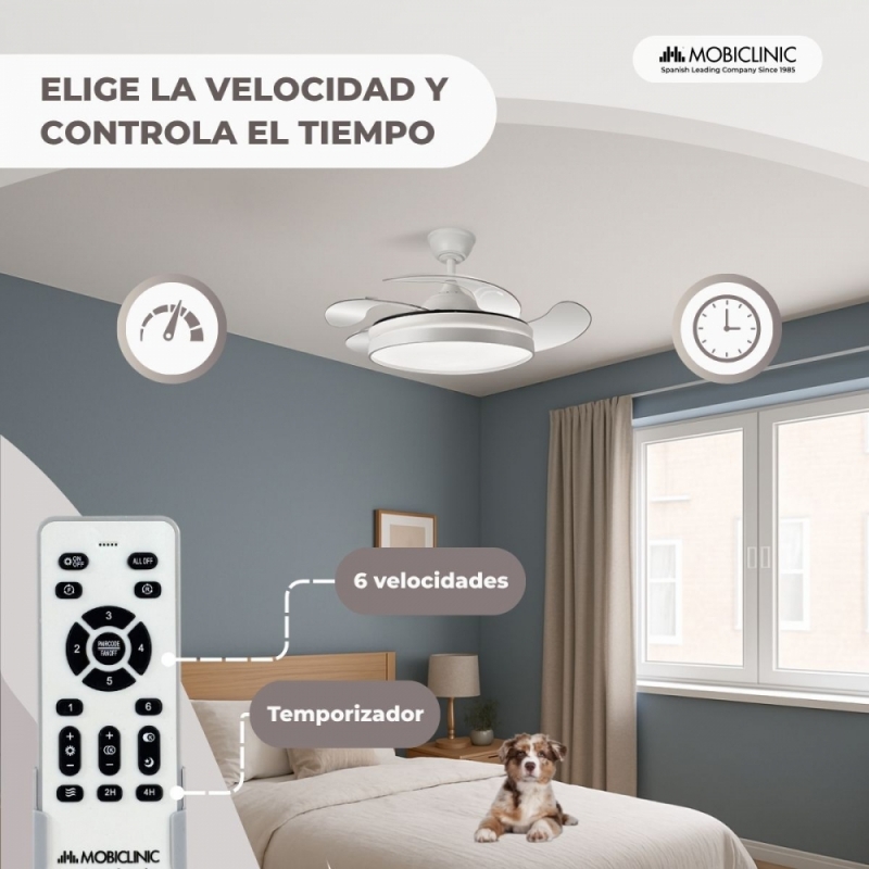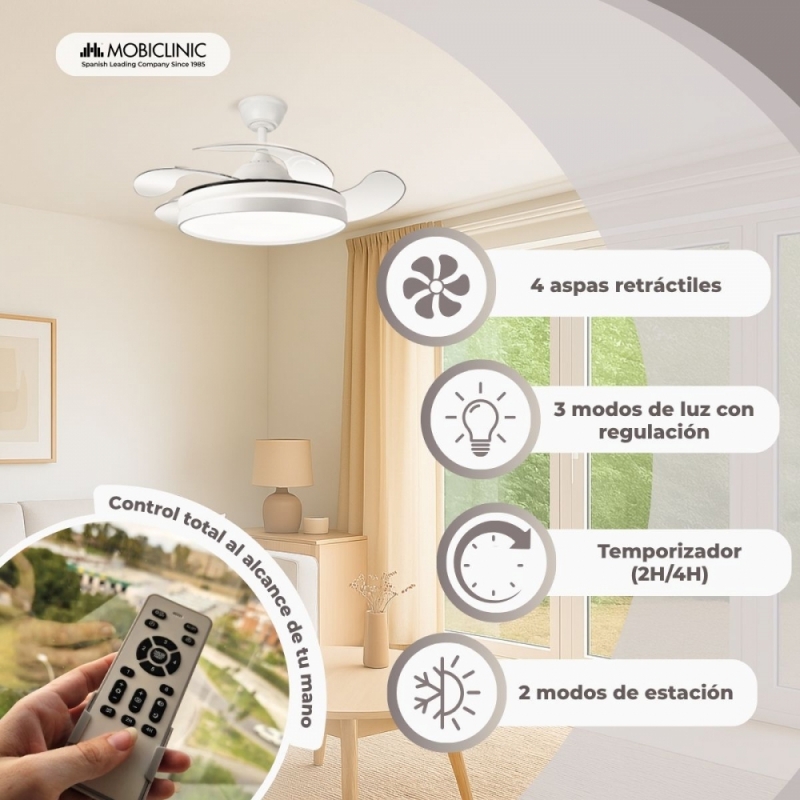 Su diseño incluye 3 modos de iluminación regulables: blanca, cálida y neutra, de 45W garantizando una iluminación perfecta para cualquier momento. Su mando a distancia facilita el control de toda las funciones, tales como regular la velocidad, modificar la luz y ajustarla o apagar y encender el ventilador. Además, incluye un temporizados programable de 2 a 4 horas, permitiendo que su apagado se produzca automáticamente, ahorrando energía y garantizando tranquilidad a los usuarios.