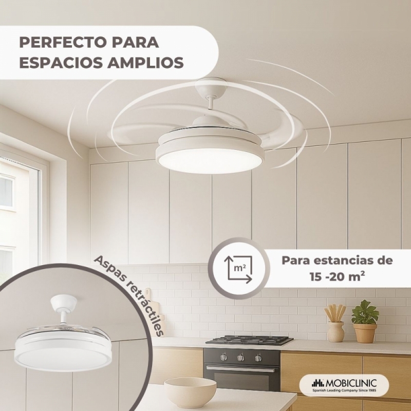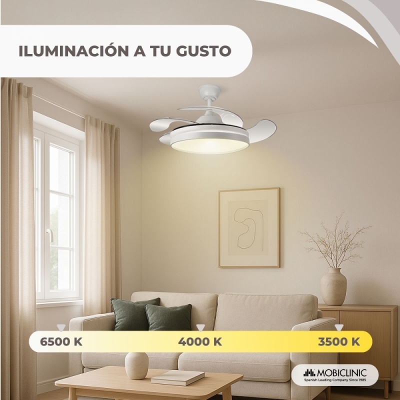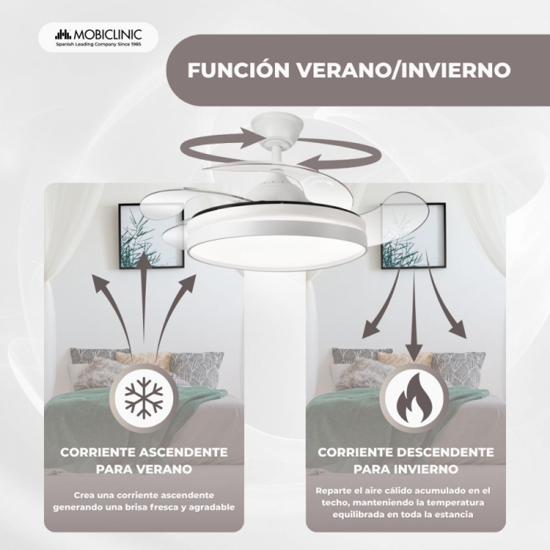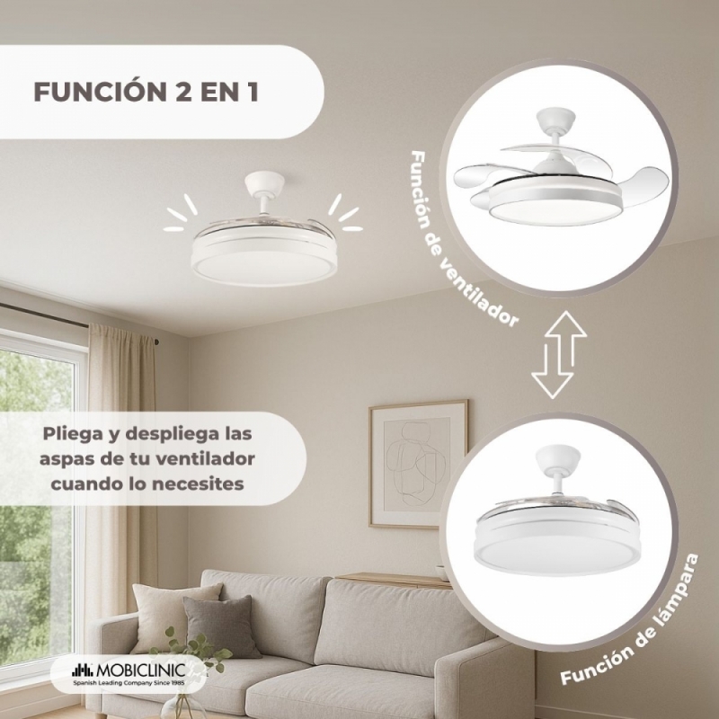 VENTILADOR 2 EN 1: Este ventilador de techo combina iluminación y ventilación en un solo producto y gracias a sus aspas retráctiles hace que pase desapercibido cuando se utiliza como lámpara. Además, tiene dos modos de ventilación para verano e invierno que permiten ajustar el sentido de las aspas para adaptarse a la época del año, convirtiéndose en una opción ideal para cualquier momento.