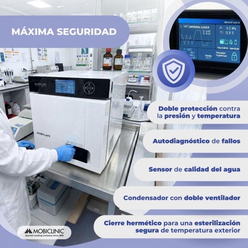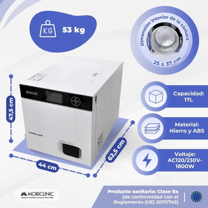 El autoclave esterilizador Mobiclinic de 17 litros está diseñado para ofrecer una esterilización completa, profesional y segura, adaptándose a las exigencias de múltiples sectores como clínicas dentales, centros médicos, laboratorios, ortopedias o veterinarios.