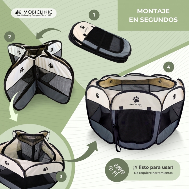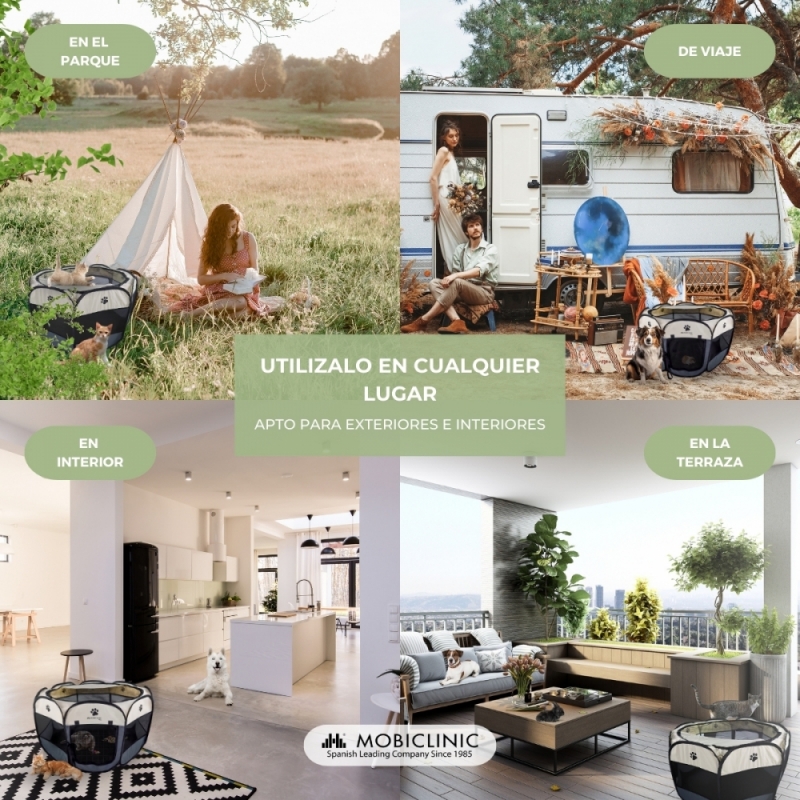 Este parque portátil ofrece a tu perro un espacio para jugar, descansar y entrenar, sin importar dónde te encuentres. Es muy útil cuando el animal tiene que guardar reposo, así no le molestarán otras mascotas del entorno.