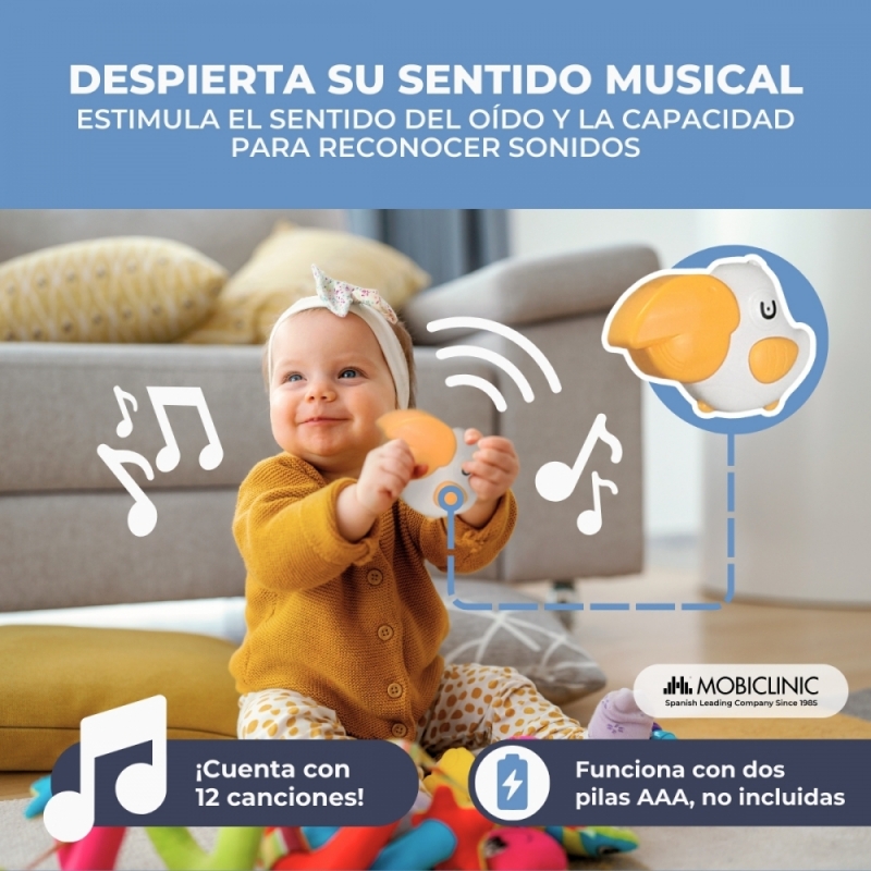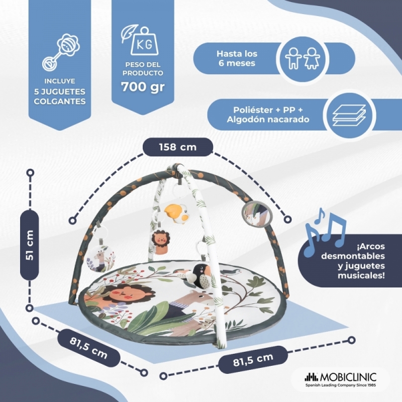 Cuenta con arco interactivo extraíble que sostiene diversos juguetes que el bebé puede alcanzar, agarrar o empujar mientras esta tumbado sobre la alfombra, esto favorece la coordinación entre las manos y los ojos. Cada juguete está diseñado para estimular los diferentes sentidos, tanto el tacto como la vista y el oído. Sus accesorios son 5 juguetes: un espejo que ayuda al pequeño a reconocer su propia imagen y desarrollar la autoconsciencia; un loro con música con 12 canciones divertidas que estimulan el sentido auditivo del bebé ayudando a su capacidad para reconocer sonidos y ritmos; dos muñecos de algodón para el desarrollo de la motricidad final y por último, un juguete con sonido crinkly que favorecerá su interacción y curiosidad al apretarlo.