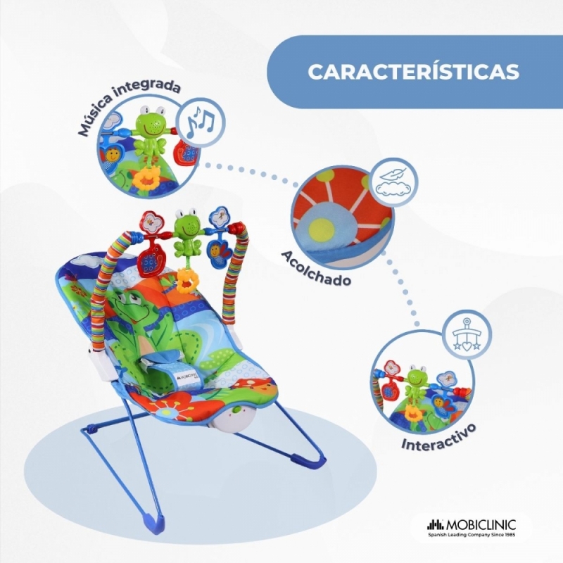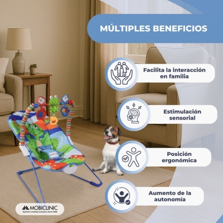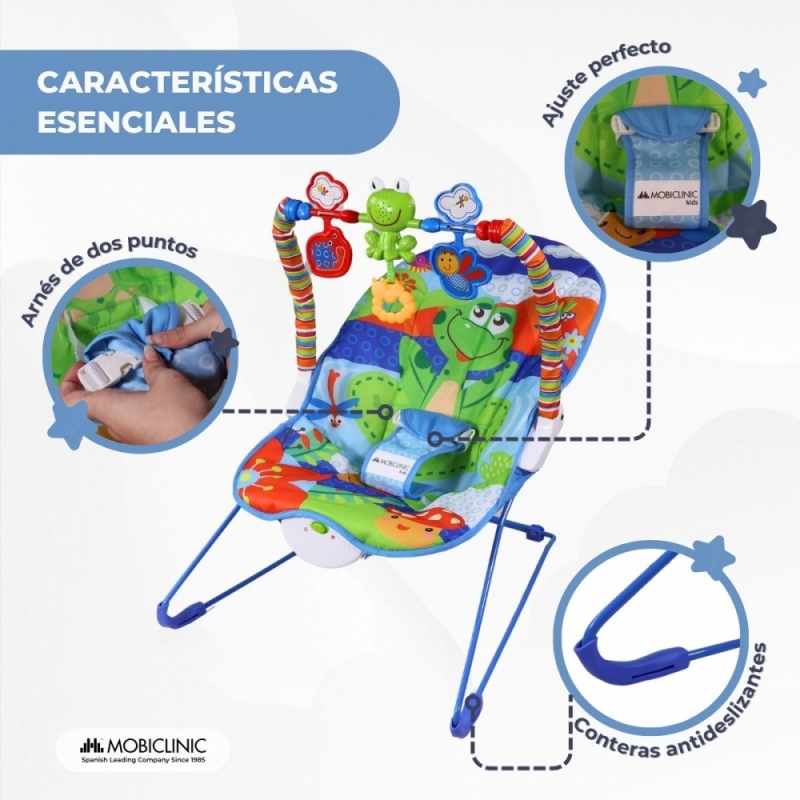 Para la opción de descanso, dispone de un sistema de vibración relajante que ayuda a calmar al bebé. Esta función es perfecta para crear un ambiente tranquilizador y cómodo. La hamaca incluye también juguetes interactivos que fomentan el desarrollo sensorial del bebé, proporcionando estímulos visuales y sonoros para llamar su atención.