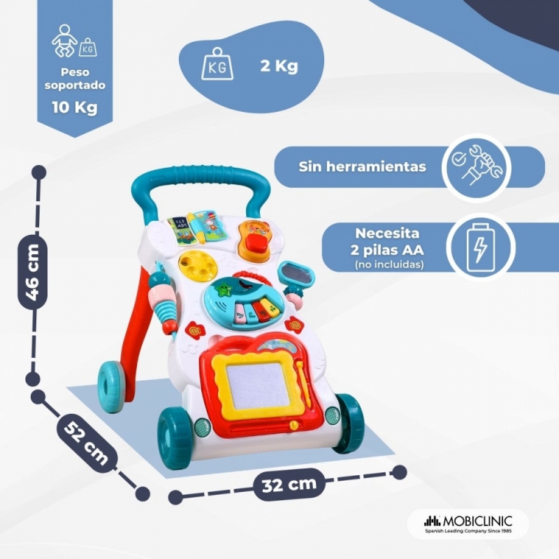 Este caminador ofrece una doble funcionalidad, sirve como andador de apoyo, permitiendo al bebé caminar apoyado en el manillar, favoreciendo el fortalecimiento de sus piernas y la coordinación. Y, por otro lado, sirve como una herramienta de juego gracias a los juguetes que incluye el panel, que garantizarán un entretenimiento y estimulación de los pequeños. El panel incluye tres juguetes extraíbles: una pizarra para que pueda dibujar, un piano eléctrico que emite sonidos y un móvil de juguete. Además, son extraíbles lo que permite que el bebé pueda jugar con ellos de manera independiente, incluso cuando el andador no esté en uso.