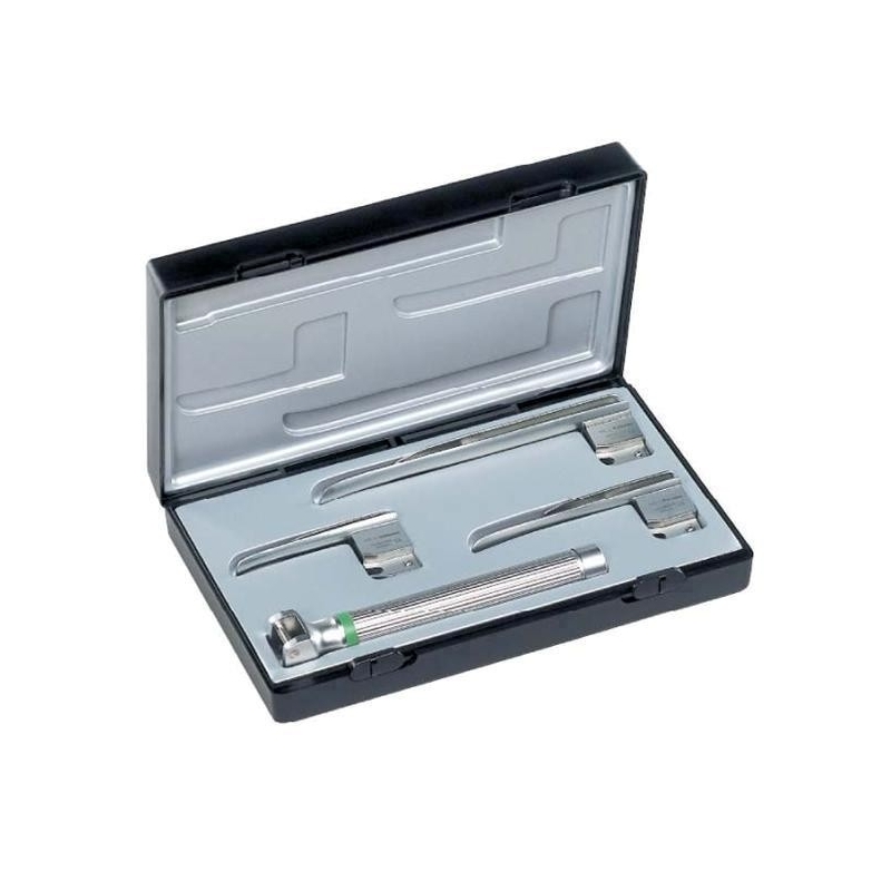 Conjunto de laringoscopio con tres palas y un mango diseñado específicamente para consultorios médicos y hospitales. El conjunto viene en un estuche rígido y protector fácilmente transportable.