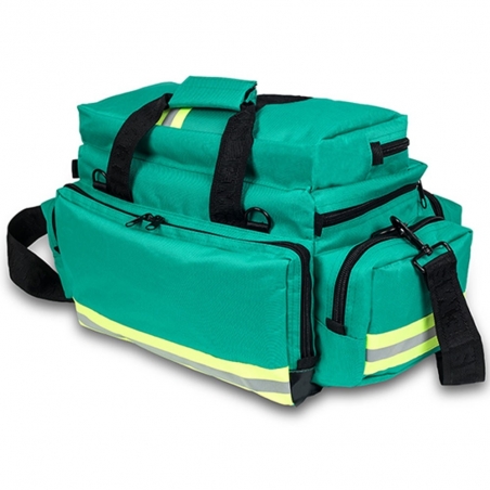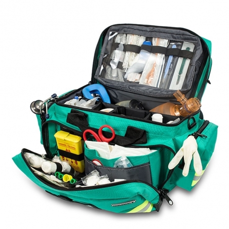 Bolsa de emergencias de Soporte Vital Básico acolchada y de gran capacidad, diseñada para alojar el material sanitario más delicado. En su interior, está subdividida en 4 compartimentos de mediana capacidad y un compartimento alargado de gran capacidad.