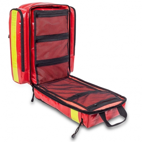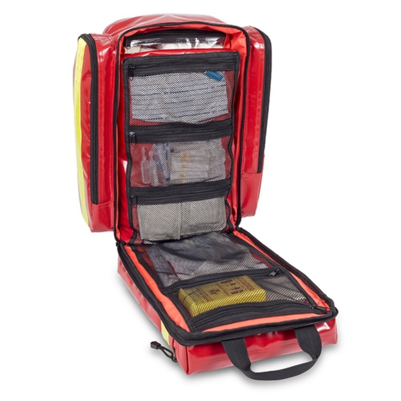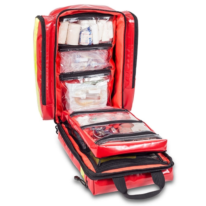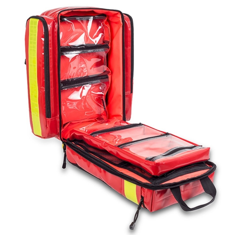 Esta mochila de rescate roja de emergencias sanitarias, cuenta en su interior separadores internos transparentes de diferentes tamaños, que se acoplan a las necesidades y medidas que un equipo de primeros auxilios demanda. Es una bolsa de trabajo de emergencias médicas impermeable, útil y segura para situaciones críticas, que por sus dimensiones y características se convierte en una de las más completas del mercado.