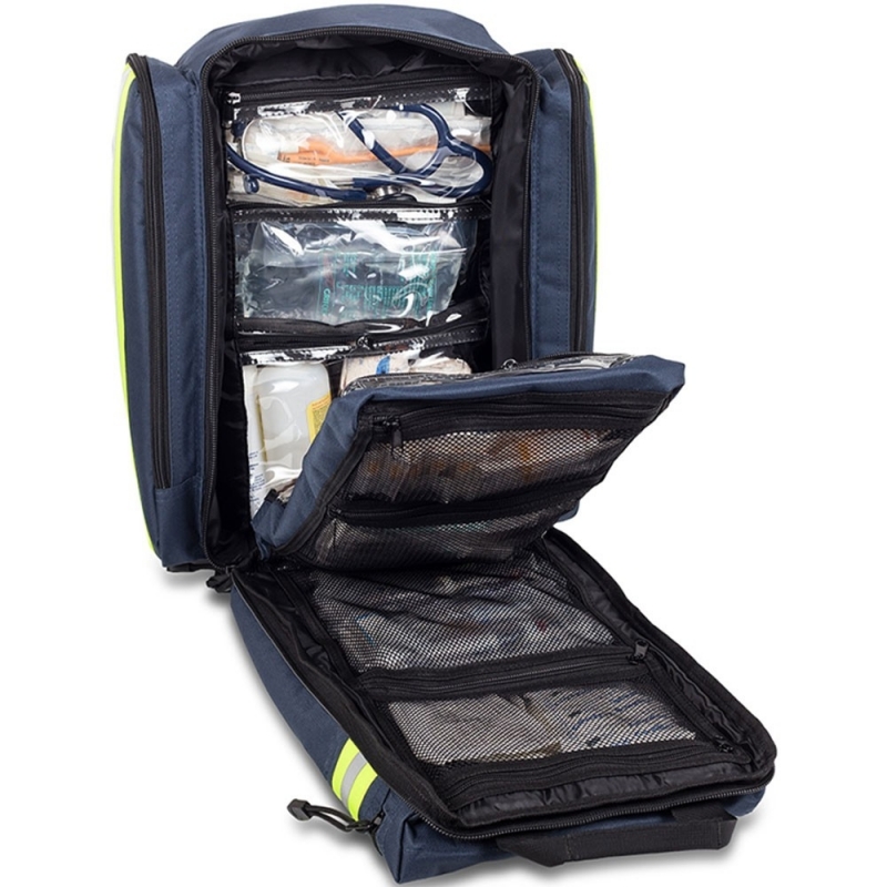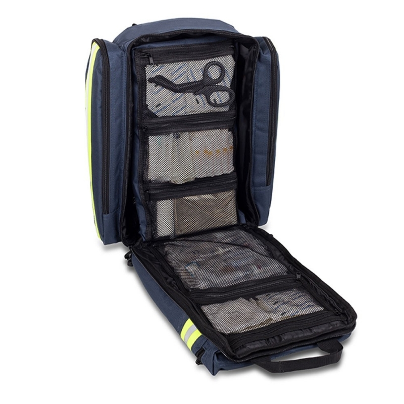 Esta mochila de rescate azul de emergencias sanitarias, cuenta en su interior separadores internos transparentes de diferentes tamaños, que se acoplan a las necesidades y medidas que un equipo de primeros auxilios demanda. Es una bolsa de trabajo de emergencias médicas impermeable, útil y segura para situaciones críticas, que por sus dimensiones y características se convierte en una de las más completas del mercado.