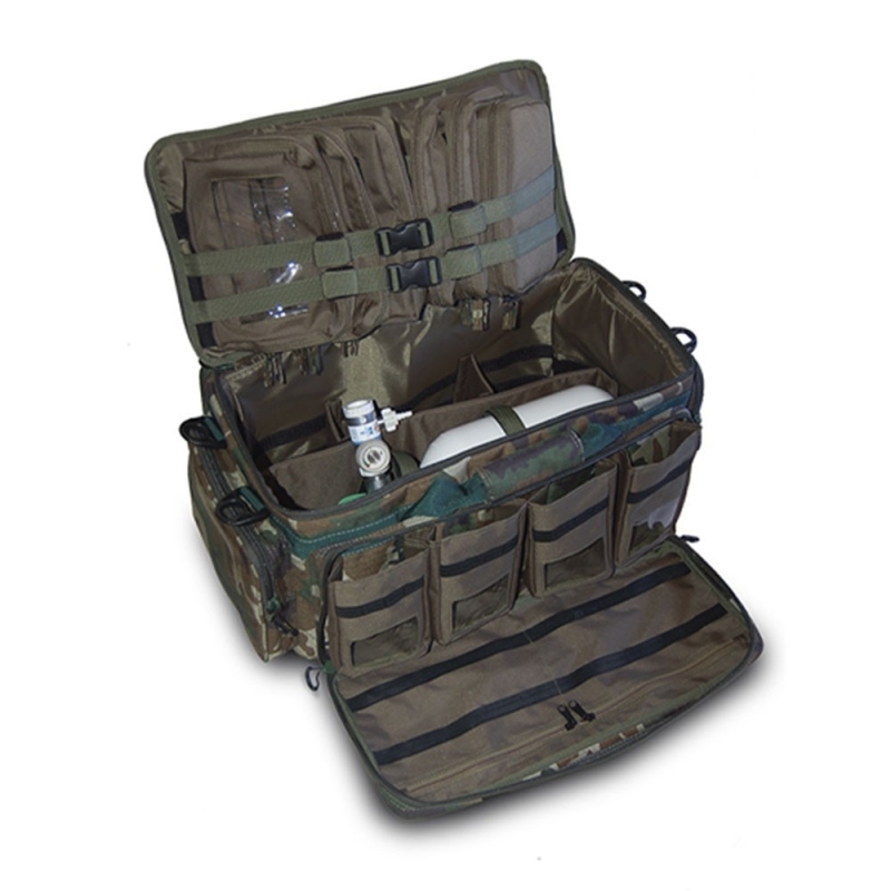 CRITICALS Equipo móvil de oxigenoterapia, camuflaje boscoso El Equipo Móvil de Oxigenoterapia es la bolsa de emergencias de Soporte Vital Avanzado (SVA). Su estructura interna está confeccionada para alojar todo el equipo necesario para tratar una emergencia crítica en la cual se requiera la aplicación de oxígeno.